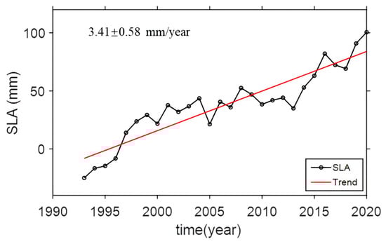 ECS regional mean sea level change from 1993 to 2020. (The black line indicates the annual average SLA, while the red line shows the annual rate of increase from 1993 to 2020).