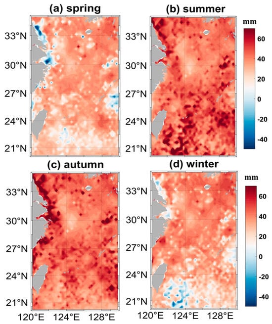 The spatial distributions of ECS averaged SLA for four seasons, for the period from January 1993 to December 2020 (mm). (Average sea level distributions for (a) spring, (b) summer, (c) autumn, and (d) winter, with red indicating higher values and blue indicating lower values, allowing direct comparison across all seasons).