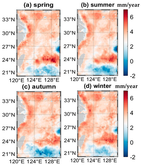 The linear-trend spatial distributions of ECS sea level change for four seasons over the period from 1993 to 2020. (Spatial distribution of the annual average sea level rise rate for (a) spring, (b) summer, (c) autumn, and (d) winter, with red indicating higher values and blue indicating lower values, allowing direct comparison of sea level distribution across all seasons).