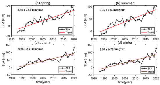An analysis of ECS regional mean sea level changes for the four seasons (spring, summer, autumn, winter) is performed for the period from 1993 to 2020, which is shown in Figure 7. The estimated rates of ECS seasonal sea level changes for the four seasons are 3.45 ± 0.66 mm/year, 3.35 ± 0.60 mm/year, 3.39 ± 0.71 mm/year, and 3.57 ± 0.75 mm/year, respectively, indicating that the sea level rise rates in spring and winter are larger than those in summer and autumn.