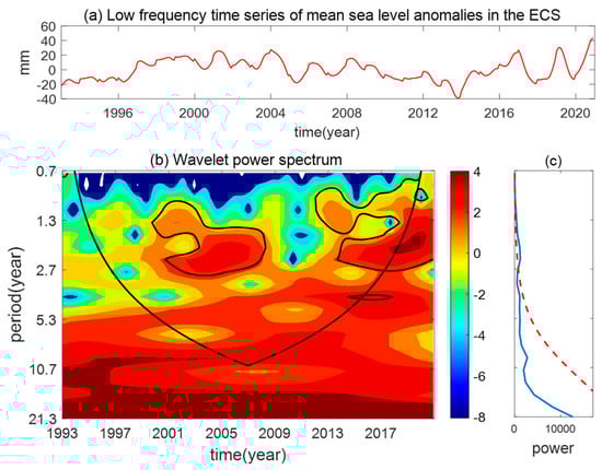 Wavelet Analysis of ECS regional mean sea level change. (Figure 8a shows the low-frequency components of the sea level time series. Figure 8b displays the wavelet energy spectrum, where red indicates higher energy and blue lower energy; the circled area passes the significance test. Figure 8c illustrates the energy values from the spectrum).