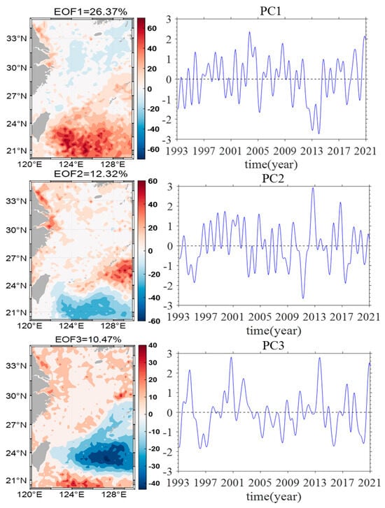 Indeed, the ECS regional mean sea level changes are influenced by various factors, necessitating a method that can effectively isolate these influences. EOF analysis is particularly useful as it breaks down sea level data into dominant variability modes. This approach helps identify key patterns and provides a clearer understanding of the factors driving long-term trends. Through empirical orthogonal function (EOF) analysis, three modes and their corresponding time coefficients were obtained, as shown in Figure 9. The spatial contributions of the first three modes are 26.37%, 12.32%, and 10.47%, respectively. The variance accounted for by the EOF modes beyond the first three is likely associated with more localized or higher-frequency variations, including mesoscale eddies or transient atmospheric effects. While these factors contribute to sea level fluctuations, their impact on long-term trends is less significant compared to the dominant modes. The spatial distributions of the first three modes indicate that the first and second modes are essentially complementary in space. The second mode exhibits similarities with the spatial distribution of seasonal variations and displays distinct seasonal variation characteristics. The correlation coefficients between the time coefficients corresponding to the three EOF modes and the SOI are 0.68, 0.035, and 0.004, respectively, indicating a strong correlation between the first mode and ENSO phenomenon. The first mode corresponds to the ENSO mode, and analysis of the time coefficient reveals a certain correlation with decadal sea level change. Moreover, the seawater depths northeast of Taiwan Island exceed 1000 m, making this area less susceptible to the thermal expansion effects of seawater induced by the ENSO phenomenon, with greater impacts observed southeast of Taiwan Island. The coastal regions experience a reduced impact primarily due to freshwater influx and anthropogenic factors, as the intensified circulation of water masses obscures interannual variability. Additionally, the influence of mesoscale eddies further diminishes the significance of the impact northeast of Taiwan [42]. In summary, the analysis verifies that the first EOF mode is closely linked to ENSO, emphasizing its substantial impact on decadal sea level variations in the East China Sea. Additionally, it shows that the deep waters northeast of Taiwan are less influenced by ENSO-induced thermal expansion, while the effects are more significant southeast of Taiwan. This underscores the critical role of spatial variability in comprehending regional sea level responses to global climate factors.