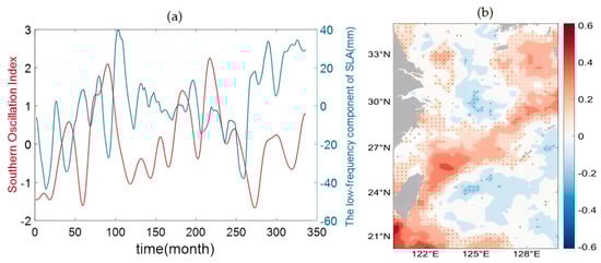 A correlation analysis method was subsequently employed to examine the relationship between the EOF analysis results and the ENSO phenomenon, with the obtained results depicted in Figure 10a. An analysis of the spatial distribution of the correlation coefficients between the SOI and ECS regional mean sea level change was subsequently conducted, as illustrated in Figure 10b. The results revealed that ECS sea level changes were significantly influenced by ENSO; notably, pronounced impacts were observed in the northern and southern regions of Taiwan Island, where most correlation coefficients exceeded 0.3. Furthermore, coastal cities in the southern part of the ECS are more susceptible to the influence of ENSO, with the majority of correlation coefficients being positive. Areas near Xiamen and Lianyungang are particularly susceptible to the effects of ENSO, with most correlation coefficients exceeding 0.1. The seasonal variation patterns and spatial distributions of ENSO and sea level changes typically exhibit contrasting tendencies, suggesting an antiphase relationship between the influences of ENSO and seasonal factors on sea level changes. The seasonal variations in sea level are relatively consistent at middle and high latitudes, with greater variability observed at low latitudes.