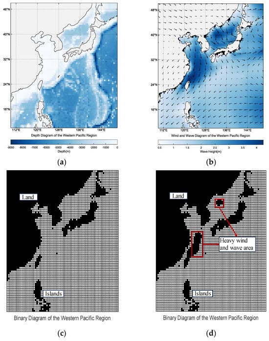 Model of the navigation environment. (a) Depth map of the sea area; (b) Wind and wave map of the sea area; (c) Grid map of the sea area considering water depth requirements; (d) Grid map of the sea area considering water depth, wind speed, and wave height requirements.