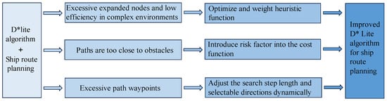 However, when applied to ship route planning, the D* Lite algorithm faces several challenges, including the expansion of too many nodes, inefficiency in complex environments, paths that are too close to obstacles, and an excessive number of waypoints. This paper proposes improvements to the traditional D* Lite algorithm: