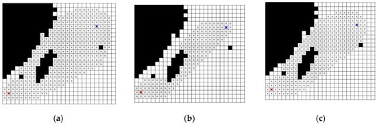 The search performance with different heuristic functions is compared in Figure 3. In the figure, using the center of each grid cell as the path search point, the red “×” represents the start point, the blue “×” represents the destination point, and the black “×” markers represent expanded nodes. The number of expanded nodes using the Euclidean Distance heuristic function is 301, that for the Diagonal Distance heuristic function is 143, and that for the heuristic function proposed in this paper is 232.