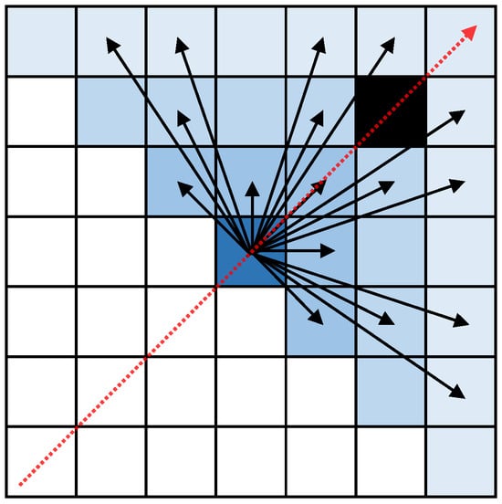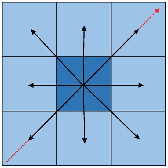 The sector-based search strategy constrains the algorithm’s search angle range, reducing the number of expanded nodes and thus decreasing the algorithm’s computational load. Since the search strategy with a step length of four (56 directions) has a long planning time and high computational complexity, a step length of three is selected in this study. The sector-based search strategy is illustrated in Figure 5, where the red arrow indicates the direction towards the destination and the black grids represent non-navigable areas. As shown in Figure 5, increasing the search step length may lead to the path crossing non-navigable areas, which can compromise the safety of ship navigation. To address this issue, this paper employs a strategy of dynamically adjusting the search step length, which uses a mixed search approach with different step lengths to solve the problem of crossing non-navigable grids, thereby enhancing path safety. The specific method is as follows: