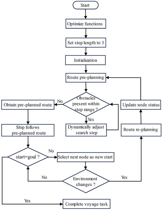 According to the improvements to the D* Lite algorithm for ship route planning and incorporating the principles of the D* Lite algorithm, the specific steps, flowchart (Figure 7) and pseudocode (Algorithm 1) of the designed algorithm are as follows: