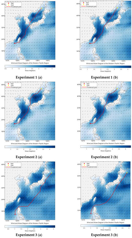 To verify the effectiveness of the proposed intelligent route planning algorithm, three sets of experiments were conducted using MATLAB 2023b software under the same hardware platform conditions, with the complexity of these conditions gradually increasing from Experiment 1 to Experiment 3. Experiments 1 and 2 have the same start and destination coordinates, (21.25° N, 117.75° E) and (45.25° N, 139.25° E), but have different hydrological and meteorological conditions. For Experiment 3, the start and destination coordinates were (13.75° N, 118.25° E) and (42.25° N, 147.25° E), with different hydrological and meteorological conditions compared to Experiments 1 and 2. This is designed to verify the effectiveness of the improved algorithm in scenarios with longer routes and more complex environments.