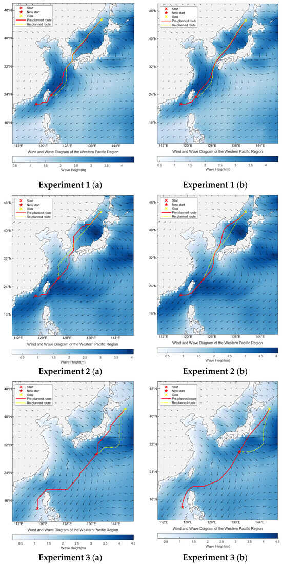 In this scenario, the environment changes dynamically, requiring the algorithms to re-plan routes. This tests the adaptability and efficiency of the algorithms in real-time or changing conditions. To test the re-planning performance of the proposed algorithm, the navigation environment was updated during ships’ travel along the pre-planned route. When ships detected changes in node states that affected its navigation, it re-planned the route using the current node as the new starting point. Experiment 1 simulated a scenario where ships’ travel along the pre-planned route was affected by strong wind and waves after the environment update, while Experiment 2 simulated a scenario where the environment update provided ships with a better route option than before. Due to significant environmental changes, the re-planned route in Experiment 3 has undergone considerable alterations compared to the pre-planned route.