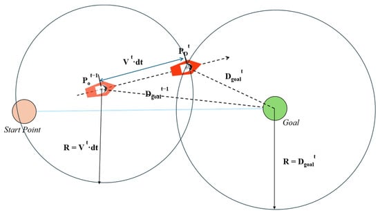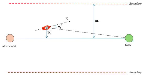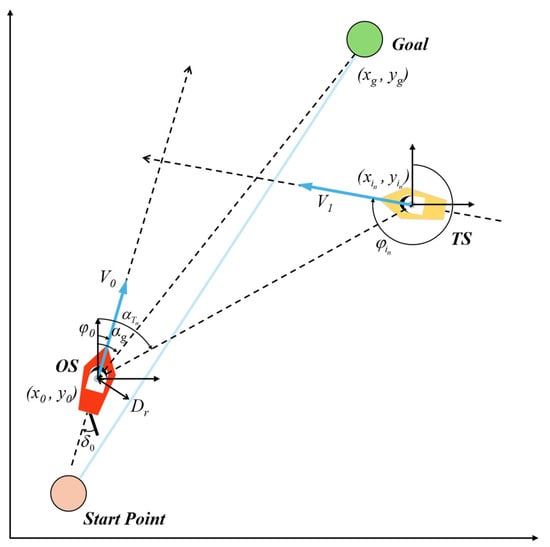 During navigation, the ship acquires relevant parameters from other vessels and calculates collision avoidance parameters, as shown in Figure 1. The positions of one’s own ship (OS), target ship (TS), and goal are (, ), (, ), and (, ), respectively. The OS’s speed is , the blue arrow indicates the direction of speed, its heading is , and its rudder angle is . The target ship’s speed is , its heading is , its bearing relative to one’s own ship is , the relative bearing from OS to the goal is , and the distance to the nearest point on the reference path is .
