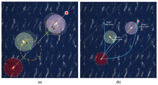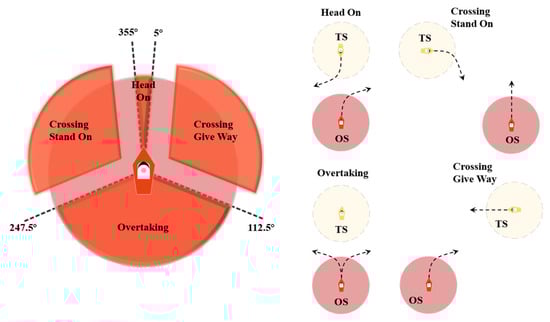 COLREGs constrain the behavior of autonomous ships. First, refer to the standards in Figure 2 to assess encounter scenarios, and then determine if the OS’s decisions comply with COLREG rules 13–17 to appropriately avoid conflicts and provide corresponding rewards. If the OS decides to alter course in a head-on or starboard-crossing situation when > 0, it is considered compliant with COLREGs, receiving a reward value of 1; in all other cases, the reward is 0.
