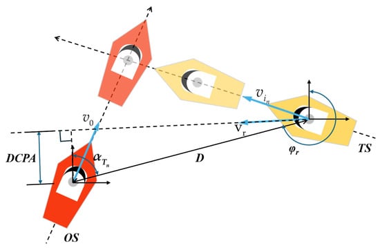 The introduction of collision risk (CR) not only simplifies the decision-making process for collision avoidance but also enhances the predictability and controllability of collision avoidance actions. The calculation of CR is based on the quantitative analysis of key parameters such as TCPA and DCPA. As shown in Figure 3, represents the distance between the two ships, is the relative heading between one’s own ship and the target ship, and indicates the bearing of the target ship relative to one’s own ship. , , and denote the speed of one’s own ship, the target ship, and their relative speed, respectively. The blue arrow indicates the direction of speed. These parameters form a comprehensive risk assessment system for ship collision avoidance, providing an intuitive and reliable method to assess collision risk.