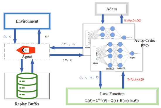 In the PPO algorithm, the loss function consists of three parts: the policy objective function , the value function term , and the entropy term [32]. These components are combined into the total loss function of PPO, where coefficients and are used to adjust the weights of the value function and entropy term. The policy objective function aims to optimize decision-making effectiveness, the value function term improves the accuracy of state estimation, and the entropy term enhances policy exploration to prevent premature convergence to local optima.