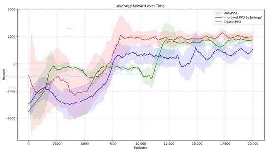 Figure 9 shows the trends in average reward values and the corresponding confidence intervals for three algorithms over 20,000 training episodes. The red curve represents the PPO algorithm with dynamically adjusted entropy (DAE-PPO), the green curve represents the entropy-inclusive PPO algorithm, and the blue curve represents the classic PPO algorithm. The shaded areas in the graph indicate the confidence intervals for each algorithm. In the early stages of training, DAE-PPO has a wider confidence interval, indicating that the algorithm adopts a broader exploration strategy initially. This strategy helps the algorithm quickly identify behavior patterns that yield higher rewards. As training progresses, after about 5000 episodes, the average reward for DAE-PPO begins to significantly increase, and its confidence interval starts to narrow, demonstrating the algorithm’s performance stability. By 8000 training episodes, the average reward for DAE-PPO stabilizes and ultimately reaches a high level. The DAE-PPO algorithm, by employing a quadratic decay interpolation of entropy, demonstrates significant advantages in autonomous ship navigation and collision avoidance tasks. This entropy decay strategy optimizes the balance between exploration and exploitation, not only enhancing the algorithm’s average reward but also its stability and reducing convergence time. In contrast, both the traditional PPO algorithm and the entropy-inclusive PPO algorithm have not surpassed DAE-PPO in terms of reward values and stability, thus confirming the superiority of DAE-PPO in such tasks.