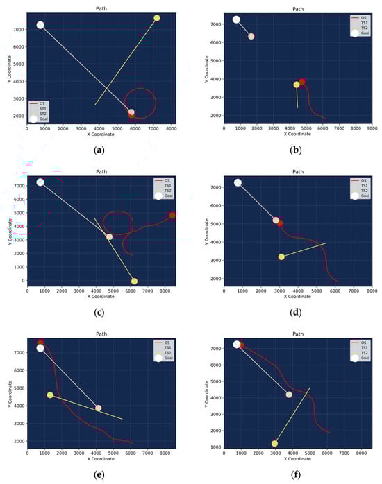 Figure 10d shows the training outcome in episode 5600, where the agent’s behavior aligns more closely with the intended guided rewards. The failed experience of colliding with obstacle ship ST1 is essential for achieving better training results.