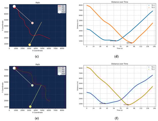 Encounter situation. (a) Path planned by classic PPO; (b) distance curve between OS and TSs for classic PPO; (c) path planned by entropy-PPO; (d) distance curve between OS and TSs for entropy-PPO; (e) path planned by DAE-PPO; (f) distance curve between OS and TSs for DAE-PPO.