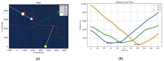 Collision avoidance environment. (a) Path planned; (b) distance curve between OS and TSs.