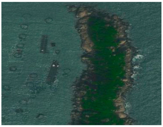 The experimental data were measured and obtained in the adjacent waters of Guishan Island, Zhuhai, Guangdong province (113.84473° E, 22.12571° N, salinity 21.5‰ and visibility of approximately 1.5 m) on 7 January, 2024. The satellite map of the experimental area and the aerial view of the experimental site are shown in Figure 1 and Figure 2, respectively.