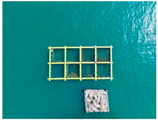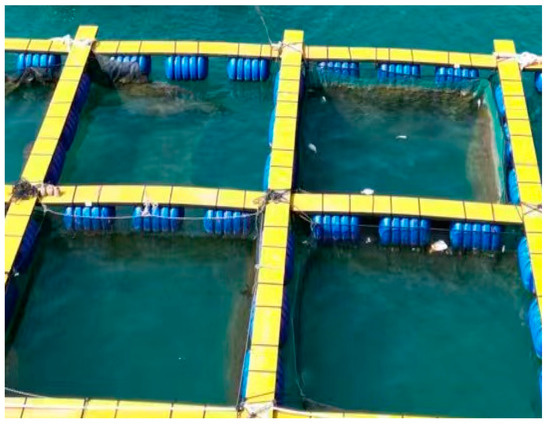 The cage used in this experiment is shown in Figure 3. The dimensions of the cage are 4 m × 4 m × 4 m. The four corners of the cage had additional weights to ensure that it remained stable underwater. However, affected by the buoyancy of seawater, the depth of the cage was approximately 2.9 m. The fish used in this experiment were Trachinotus ovatus under normal culture conditions. The body length of the fish was approximately 24 cm (Figure 4).