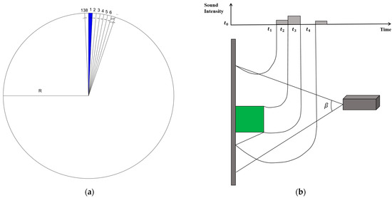 In the measurement of each detection angle, the sonar emits a sound signal forward, and the echo signal reflected from the target object within the beam’s irradiation area is received by the sonar for imaging. The detection beam emitted by the sonar is horizontally divided into several fan-shaped beams with vertical opening angles. Each beam illuminates the target, as shown in Figure 5b, forming a set of distance and intensity information. The echo intensity information of all beams is arranged based on position relationship to create the sonar image. The intensity of the echo signal reflects the acoustic reflection characteristics of different target objects, while the resulting time delay is used to determine the actual distance of the target object relative to the sonar position.