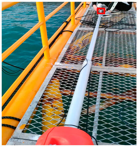 The sonar is shown in Figure 6, and it was designed to be connected to the end of the silver electric telescopic rod depicted in Figure 7. The telescopic rod drove the sonar to achieve unidirectional, uniform, vertical movement. Both the telescopic rod and the sonar were connected to 24 V batteries for their power supply. The maximum telescopic speed of the rod was 2.8 cm·s−1, with a maximum range (fully extended) of 6.41 m (allowing access to the bottom of the cage), a fixed length (not extended) of 1.5 m, and a telescopic capacity of 4.9 m. The rod was supported by an orange float to keep it suspended above the water surface. The omnidirectional scanning sonar was used for underwater measurement, and the data were transmitted back to the computer. The sonar operated in low-frequency mode, and the range was set to 3 m, based on the maximum radius of the cage (approximately 2.8 m).