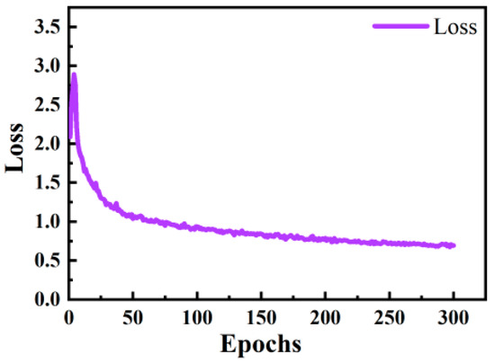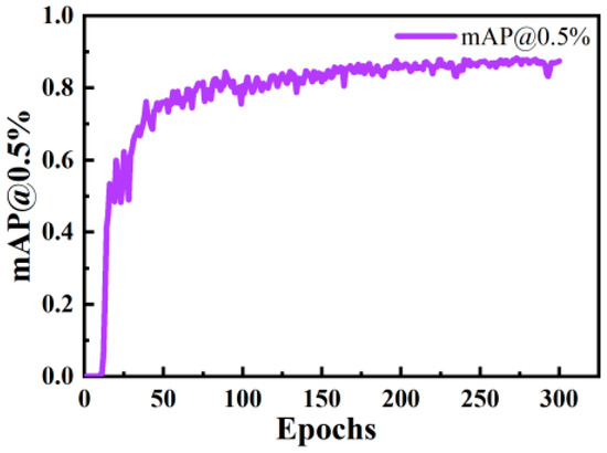 When training the detection network model, the following parameters were set: the number of iterations was 300, the weight decay coefficient was 0.0005, the initial learning rate was 0.01, the learning rate momentum was 0.937, and the batch size was 16. As shown in Figure 9 and Figure 10, the model stopped training after 300 iterations. At this point, the loss had decreased to 0.69 and the mAP@0.5% had reached 87.4%.