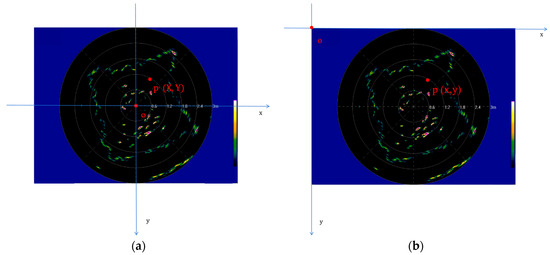 Coordinate transformation. (a) A coordinate system with sonar as the origin; (b) A coordinate system with the top left corner as the origin.
