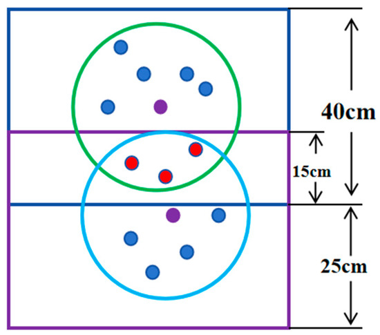 In Figure 12, the purple and blue boxes represent different water layers. The blue and green hollow circles denote the radius of clustering. Solid circles represent fish. The purple solid circle indicates the core object of a cluster, while the red solid circle represents the data of the same fish observed in different water layers. The summarized three-dimensional coordinate data were divided into 11 water layers, each with a depth interval of 40 cm. This spacing was determined using a trigonometric function based on the sonar beam opening angle and the scanned radius of the cage. The data were segmented into 11 water layers, with an overlap of 15 cm between adjacent layers, based on the body length and height of the fish used in the experiment. The overlap between water layers was intentional to account for the possibility that fish might move between layers during measurement. This overlap helped minimize the impact of repeated scanning data on the coordinates of fish after clustering, ensuring a more accurate representation of fish locations.