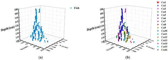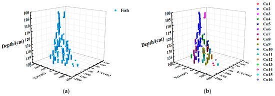As shown in Figure 14, the data of 5384 points in the 100–140 cm water layer were selected from the sonar images for experimental analysis. All data points of the water layer are shown in Figure 14a, and experimental results after clustering parameters (epsilon = 20.0, min_samples = 1) are displayed in Figure 14b. In Figure 14b, the red “★” (Cu1) represents the noise point identified by clustering, totaling one noise point. The remaining clusters, composed of core objects, are also shown, with a total of 15 clusters identified, excluding noise points. In the statistical process, clusters are counted as single fish. Noise points are counted individually as each represents an independent fish. The ”Noise” cluster, which consists solely of noise points, should not be counted as a fish. This method ensures that both core objects and noise points are accurately accounted for in the fish distribution analysis.