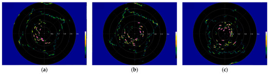 In conjunction with the analysis of fish distribution characteristics in culture cages as reported in the literature [33,34,35], the primary reasons for these observed distribution patterns can be summarized as follows: The primary factors influencing the vertical distribution of fish are water temperature and dissolved oxygen levels. Variations in these factors affect how fish distribute themselves vertically within the water column. Specifically, fish tend to position themselves in layers where water temperature and dissolved oxygen are optimal for their survival and comfort. Considering that, at 8:00, the temperature is low (16 degrees Celsius) and the temperature of seawater will drop after overnight loss, so the fish will be distributed in the middle and lower layers of the cages, and under the influence of the low temperature the fish’s appetite and activity are not high; as the sun rises, the temperature of the seawater gradually rises, and at 13:00 (19 degrees Celsius), the fish tends to be in the middle and upper areas of the cages, and under the influence of the long-term rearing, the fish will tend to be in the upper-middle waters of the cages waiting for food; at 18:00, the seawater has some temperature and has not yet been lost after a day of sunshine, and the seawater temperature is higher although the temperature is close to that at 8:00 in the morning, so the distribution of the fish will show a small amount of folding back to the lower-middle waters.