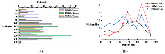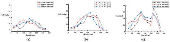 As shown in Figure 26, with the change of seawater temperature, some changes in fish distribution also occurred. As shown in Figure 26a, at 8:00, the distribution of fish was mainly concentrated in the 2 m water depth range. At 13:00, the distribution of fish gradually shifted to the 1 m water depth range as the temperature increased; finally, at 18:00, the distribution of fish returned to the 1.5 m water depth range. As shown in Table 5, data numbered 1, 7, and 13 are for 8:00; data numbered 3, 9, and 15 are for 13:00.; data numbered 5, 11, and 17 are for 18:00; data numbered 1, 3, and 5 are for 100 fish; data numbered 7, 9, and 11 are for 150 fish; and data numbered 13, 15, and 17 are for 200 fish. From 1, 7, and 13, it can be seen that at 8:00 the fish are mainly distributed at 2 m and the distribution expands to both ends as the number increases, with the peak of the number expanding to 1.25 m and 2.25 m when the number reaches 200 fish. From 3, 9, and 15, it can be seen that the distribution of the number of fish gradually expands towards the surface as the temperature of seawater increases, and the number of fish in the shallow water above 1 m gradually increases. From 5, 11, and 17, it can be seen that the number of fish in the shallow water areas decreased, but still remained higher than the number at 8:00 Among the three sets of data from 13, 15, and 17, the three changes in the distribution of 200 fish were closer to each other, with peaks in numbers mainly in the 1.25 m and 2.25 m areas.