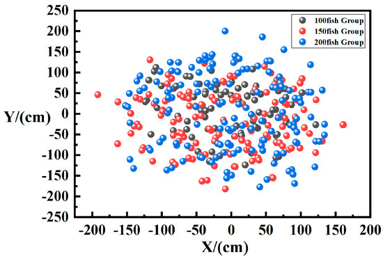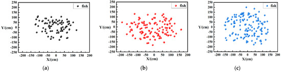 Horizontal distribution maps of fish. (a) Horizontal distribution of 100 fish; (b) Horizontal distribution of 150 fish; (c) Horizontal distribution of 200 fish.
