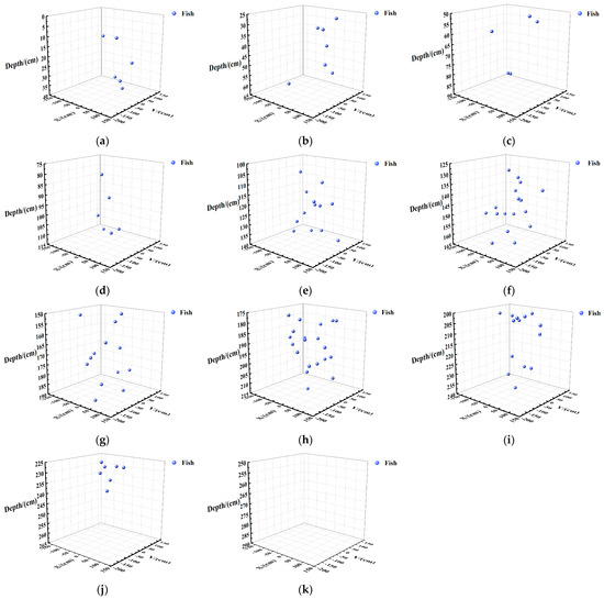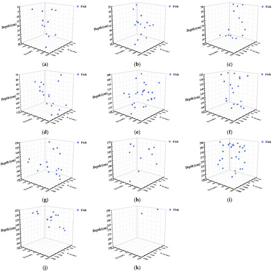 Spatial distribution maps of 200 fish in each water layer. (a) Water layer: 0–40 cm; (b) Water layer: 25–65 cm; (c) Water layer: 50–90 cm; (d) Water layer: 75–115 cm; (e) Water layer: 100–140 cm; (f) Water layer: 125–165 cm; (g) Water layer: 150–190 cm; (h) Water layer: 175–215 cm; (i) Water layer: 200–240 cm; (j) Water layer: 225–265 cm; (k) Water layer: 250–290 cm.