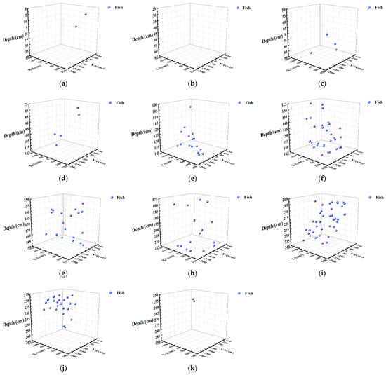 Spatial distribution maps of 100 Fish in each water layer. (a) Water layer: 0–40 cm; (b) Water layer: 25–65 cm; (c) Water layer: 50–90 cm; (d) Water layer: 75–115 cm; (e) Water layer: 100–140 cm; (f) Water layer: 125–165 cm; (g) Water layer: 150–190 cm; (h) Water layer: 175–215 cm; (i) Water layer: 200–240 cm; (j) Water layer: 225–265 cm; (k) Water layer: 250–290 cm.
