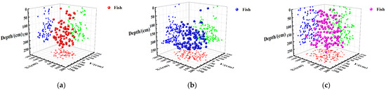 The 3D data for each water layer were clustered using DBSCAN clustering analysis, with the following parameter settings: epsilon = 20.0, min_samples = 1. Considering the body length of the fish (approximately 24 cm) and their body height (approximately 12 cm), as well as the tendency for fish to school, the radius of clustering was set to 20.0 cm. This radius was chosen because fish typically do not stay very close to each other for extended periods. In this clustering setup, a hypersphere with a center at the coordinate of each fish and a radius of 20 cm was used. If additional coordinate points fell within this hypersphere, they were considered to belong to the same fish, since multiple fish are unlikely to be positioned very close to each other for long periods. Thus, the DBSCAN parameters were chosen to ensure that individual fish could be distinguished even if they were close together, reflecting the experimental conditions and the natural behavior of the fish.