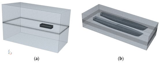 The initial consideration is the application of verification calculations using a single catamaran. The size of the computational domain in this section was determined based on a single catamaran, with appropriate adjustments made when applying to scenarios involving two catamarans, while keeping other settings consistent. Overset mesh technology was employed in the numerical simulation of a ship sailing in waves. Before meshing, the complex watershed must be divided into the background domain and the overset domain. The overset domain should be capable of containing the entire hull and cooperating with its movements. When the overset domain moves, it forms an interface with the background domain, facilitating information exchange between the grids. In this study, a rectangular cuboid computing domain was utilized, as illustrated in Figure 3a,b. The front end of the computational domain was 1.5 from the bow, while the back end was 4 from the stern. The width of the computational domain was 3 , and the depth of the computational domain was 3.5 . The height of the computational domain’s bottom was set to twice the ship’s length from the keel, ensuring that the bottom of the domain did not interfere with changes in the flow beneath the ship or the formation and development of wave patterns, thereby minimizing the impact of boundary conditions on the simulation results. However, as the distance increased, computational costs also rose, necessitating a balance between accuracy and computational efficiency. Generally, a distance of twice the ship’s length is considered reasonable, with further increases having minimal impact on the results. Of the six boundaries, only the rear boundary behind the stern was set as a pressure outlet, while the remaining five boundaries (top, front, bottom, left, and right surfaces) were configured as velocity inlets. The boundary conditions for all cases in this study remained consistent.