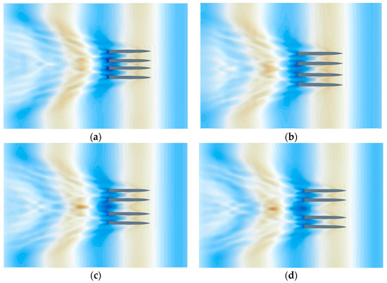 Figure 16 illustrates the free surface deformations of tandem formation at different longitudinal distances. Both catamarans generated stern waves in the process of moving forward. The stern wave from the leader catamaran disturbed the stern wave from the follower catamaran, affecting the flow field around the follower. The surface pressure on the follower catamaran was redistributed, altering the wave-making resistance. This led to changes in the surrounding flow field, resulting in a redistribution of surface pressure on the follower catamaran and subsequent changes to its wave-making resistance. The resistance and motion of the leading catamaran were observed to be similar to those when sailing alone, mainly due to the high speed of the Delft-372 catamaran. In this scenario, waves from the trailing catamaran were propagated by splash effects, causing minimal disruption to the wake of the leader catamaran. Consequently, the flow field around the leader catamaran was observed to be less affected by the presence of the trailing catamaran.