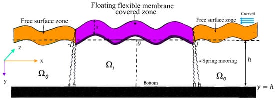 The floating flexible membrane of finite length and finite width occupies the region on the mean free surface over an impermeable sea bed making an angle θ along the direction of wave propagation in the positive direction of the x- and z-axis referred to as the following current; hence, the components of the current are , and the floating flexible membrane is connected with spring moorings with stiffness for j = 1, 2 at the edges of the horizontal flexible membrane (see Figure 1).