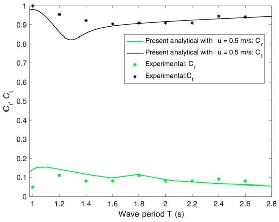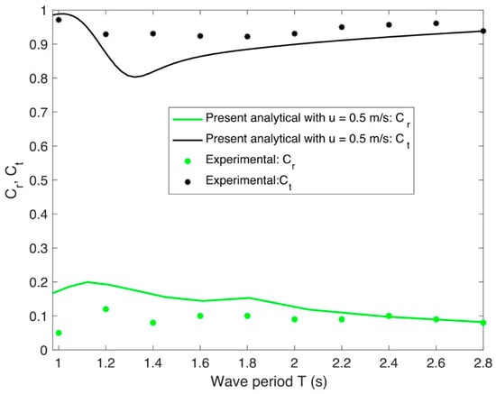 To check the level of accuracy, in this subsection, the present analytical results of reflection and transmission coefficients on different spring stiffnesses are compared against the experimental model test results with no current [] versus wave period .