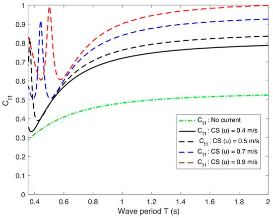 Figure 4 plots the influence of u and no current on the versus wave period T(s) with membrane tension, spring stiffness, and versus wave period. An elevation in current value corresponds to a heightened transmission coefficient (Ct1). This is because of the higher deflection of the floating flexible membrane caused by a higher CS, thereby enabling the transmission of greater wave energy beneath the membrane. It is evident that in the absence of currents, no peak is observed in Ct1, and the trend of Ct1 is almost linear.