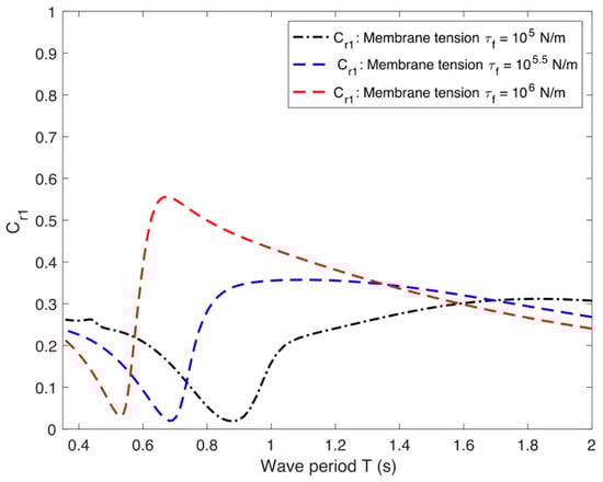 Figure 5 depicts the impact of the tensile force of the floating membrane on the versus T(s) with spring stiffness , , and . It is observed that the reflection coefficient increases with an increase in tensional force on the membrane. However, this effect becomes reversed for a higher wave period. Due to the membrane’s higher tensile strength (), it exhibits reduced deflection, resulting in decreased wave energy transmission and increased wave reflection.