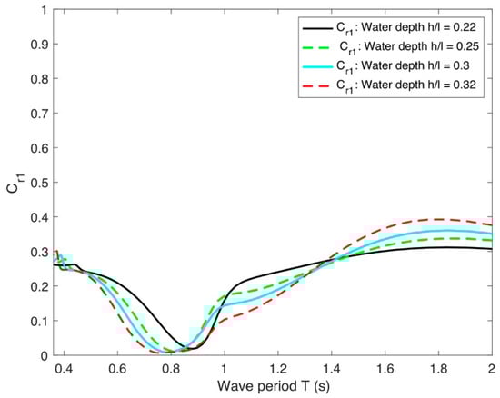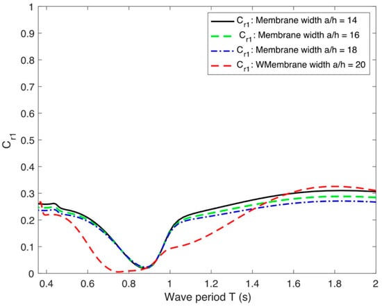 In Figure 2, when T 2.4, the analytical result for Cr converged with the experimental model data sets [], whilst the Ct values were very close, but at a specific wave period, it also converged with the experimental model presented in reference []. However, for the lower wave period, the discrepancy arises from the exceptionally low tension of the membrane materials used []. This low tension suggests that the membrane’s tension reduced the efficiency of reflecting incident waves, particularly for higher wave periods, resulting in increased transmission.