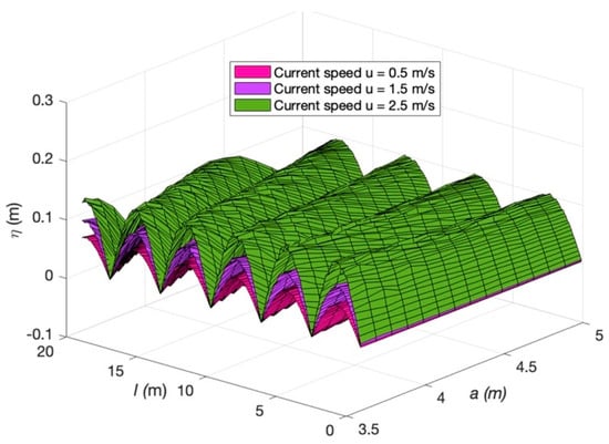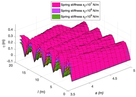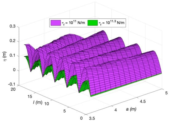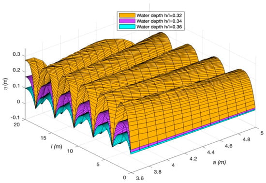 In Figure 11, the effect of different water depth on the 3D deflection of the HFFM versus channel length and width for are plotted. It is found that the deflection decreases as the depth of water increases, which is because the wave force on the membrane becomes lower as the increases.