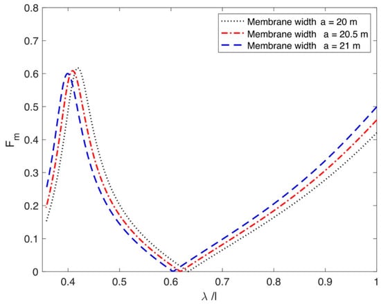 Figure 13 shows the effect of membrane width on the non-dimensional vertical wave force where and CS versus non-dimensional wavelength . In general, the wave force on the HFFM lessens as the width increases. However, for an intermediate value of wavelength, the effect is just reversed in nature.