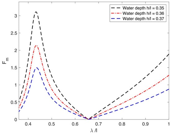 Figure 16 depicts the effect of water depth on the non-dimensional vertical wave force versus non-dimensional wavelength . It is found that as the water becomes deeper, the vertical wave load on the membrane usually becomes smaller. Further, at an intermediate wavelength, vertical loads reach a minimum.