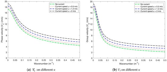 This subsection examines the impact of current velocities and varying water depths on the phase and group velocities. From the dispersion relation (23), one can derive the phase velocity () and group velocity (Vg) in the presence of CS by neglecting [] in different water depths, as follows.