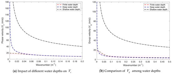 Comparison of (a) phase velocities and (b) group velocity between different water depths.