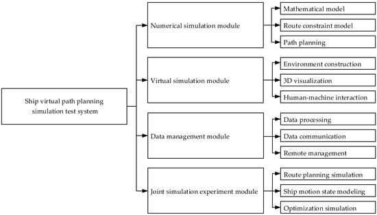 The remainder of this paper is organized as follows: In the Section 2, we introduce the fundamental architecture of the ship virtual path planning simulation test system. The Section 3 details the construction of both the numerical simulation platform and the virtual simulation platform, wherein a novel route constraint model incorporating environmental disturbances is proposed. In the Section 4, we validate the ship virtual path planning simulation test system to evaluate its performance.