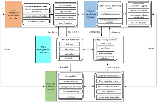 The Joint Simulation Experiment Module simulates the impact of real marine environment disturbances on vessel movement for the operator. The Virtual Simulation Module, utilizing a virtual dynamic positioning model and a virtual ocean environment, achieves real-time simulation and navigation of USVs through dynamic light tracing and environment rendering optimization technologies. The Data Management System is responsible for reading, storing, updating, and processing data, ensuring real-time accuracy through data filtering, fusion, and calculation, while providing efficient data communication interfaces. The Numerical Simulation Module handles USV ship modeling, sea-state modeling, and planning algorithm design, enabling simulation process control and system status assessment through model construction and path planning validation. Interactions between these components, driven by data and statistical information, ensure synchronous operation between the physical and virtual platforms, guaranteeing the realism and reliability of simulation tests, and thereby comprehensively evaluating the autonomous navigation performance of USVs.